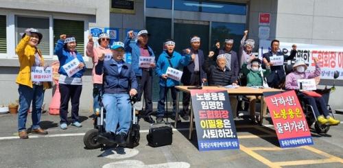 ◇홍천군지체장애인협회는 지난 24일 협회 사무실 앞에서 기자회견을 열고 도협회의 신임 지회장 임명을 철회하라는 성명을 발표했다.