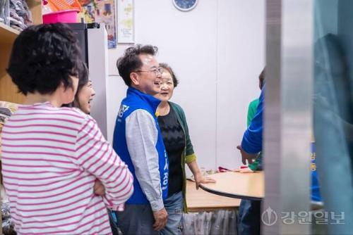 【춘천】육동한 더불어민주당 춘천시장 후보가 27일 춘천 동부시장을 방문해 상인들과 간담회를 갖고 전통시장 활성화 방안과 현장의 애로사항을 청취했다.