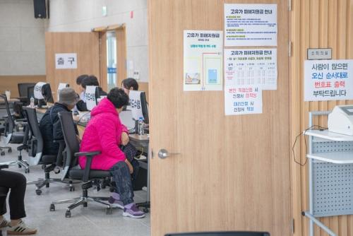 고성군이 27일 고유가 피해지원금 1차 지급 시기에 맞춰 전담 창구 설치 운영에 나선 가운데 거진읍과 토성면 행정복지센터에서 지역 주민들이 지원금을 신청하고 있다. 군은 지역 내 각 읍·면 행정복지센터에 전담 창구를 설치해 운영한다.