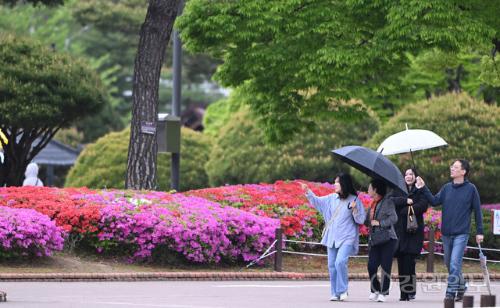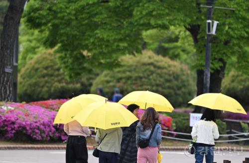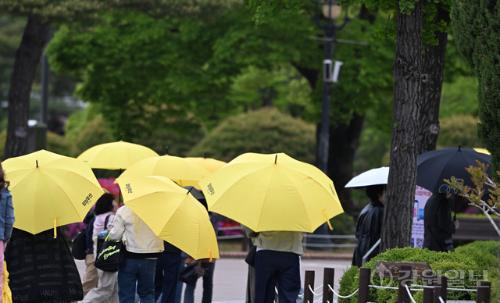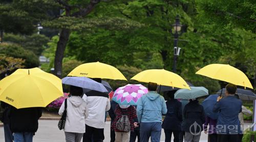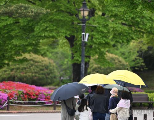 비가 내린 28일 강릉시 오죽헌에서 관광객들이 우산을 쓰고 경내를 둘러보고 있다. 강릉=권태명기자