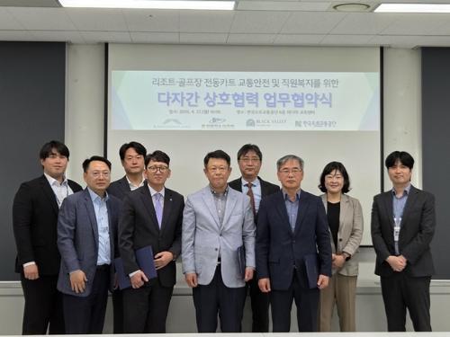 ◇골프장 전동카트 교통안전 및 직원 복지를 위한 다자간 상호협력 업무협약식이 지난 27일 원주시 한국도로교통공단 본부에서 박영신 강원랜드 동반성장실장을 비롯한, 장석용 한국도로교통공단 미래인재교육처장, 이경연 문경레저타운 관리본부장, 김강삼 블랙밸리컨트리클럽 운영실장 등이 참석한 가운데 열렸다.