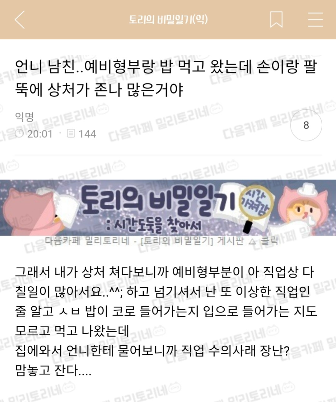 예비 형부 손이랑 팔에 상처가 많은거야..