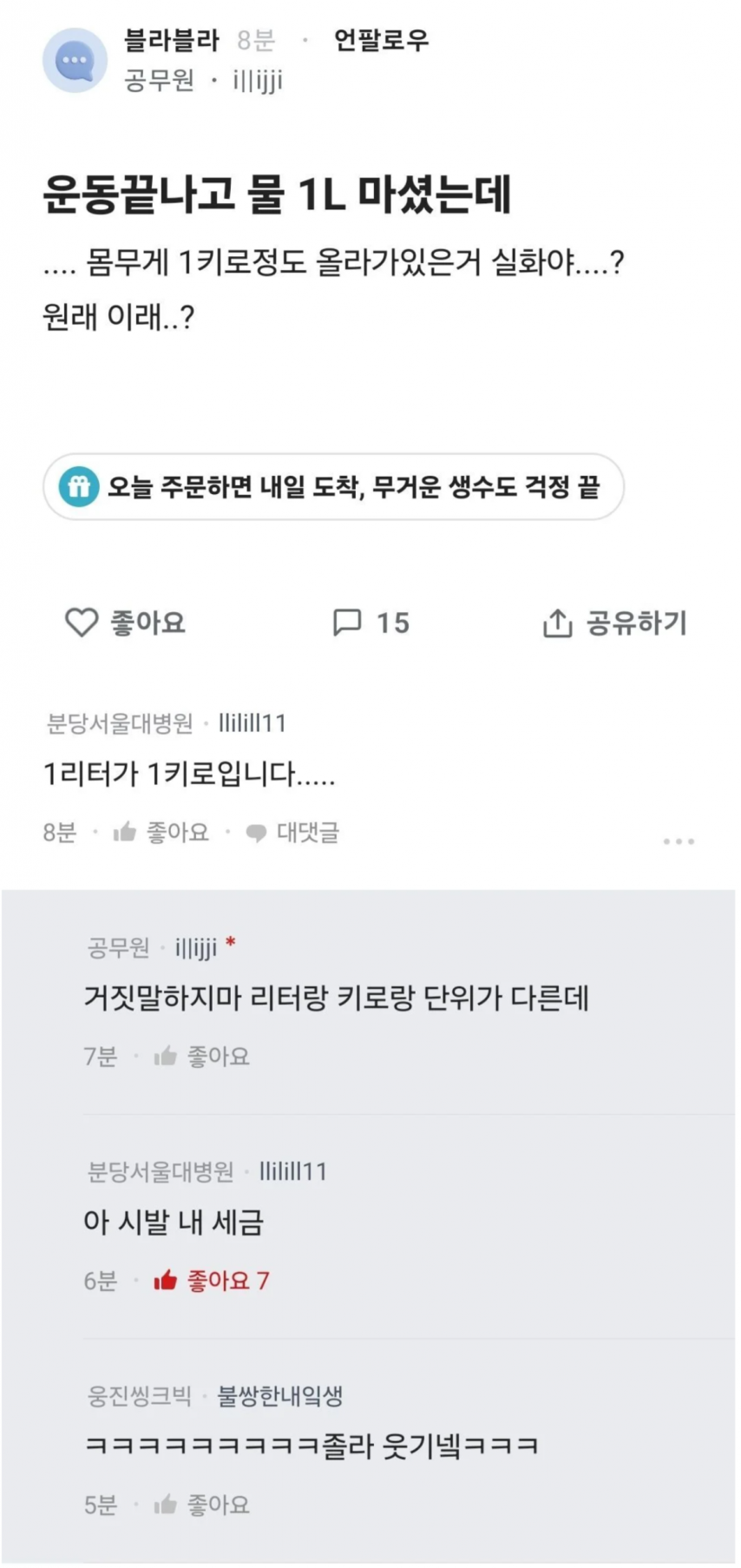 운동 끝나고 물 1L 마셨는데