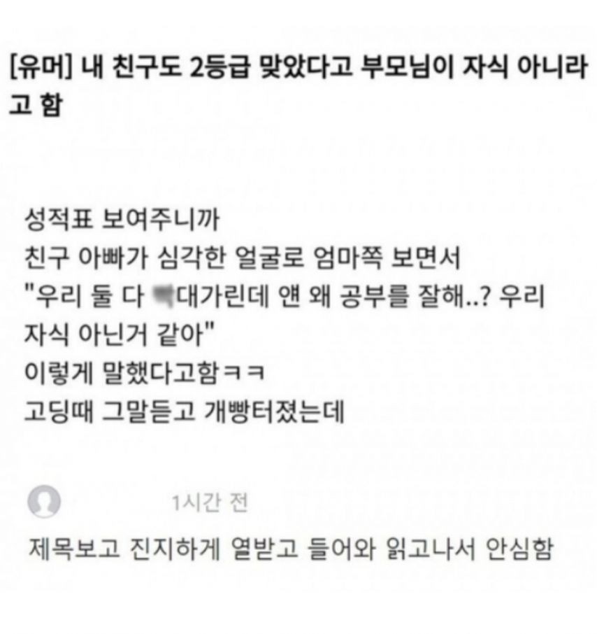 자식이 2등급 맞았다고 내자식 아니라고 한 부모