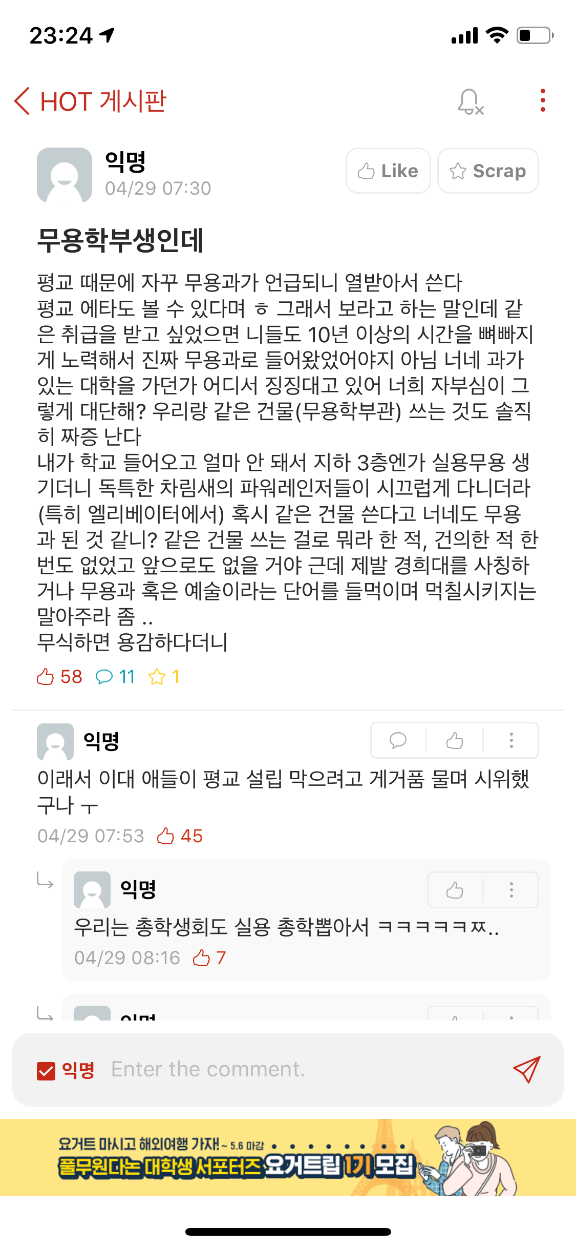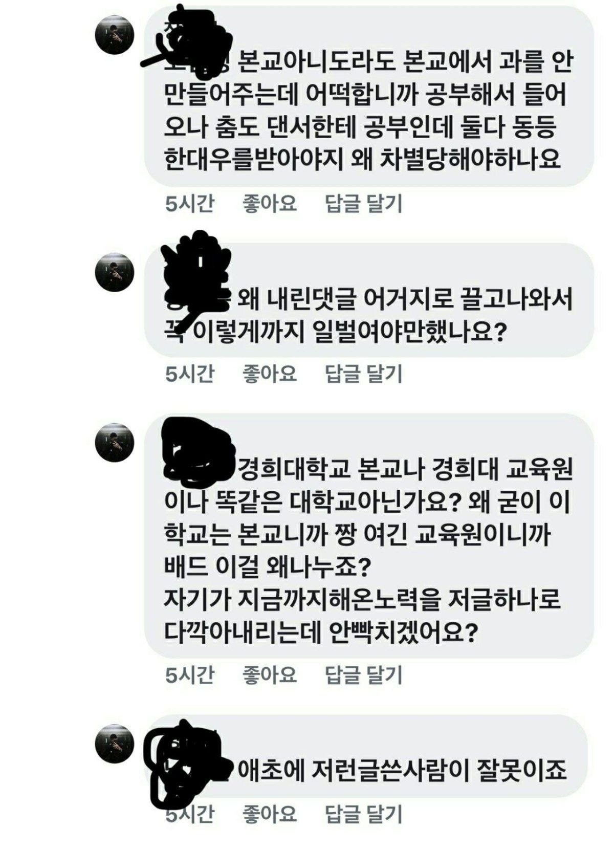 그런데 실용무용과 학생들이 본인의 페북, 인스타에 서울캠퍼스 실용무용'과'라고 올리는게 학과 창조/ 사칭을 하는게 아니냐는 논란이 생김
