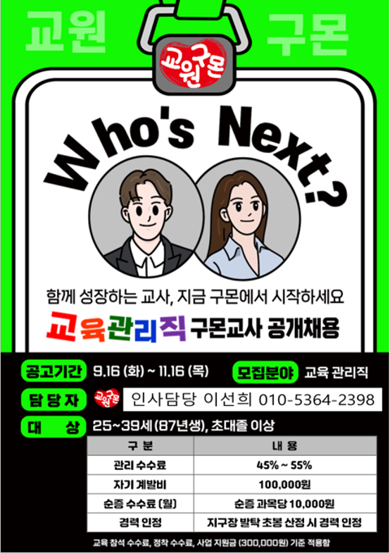구몬학습에서 교육관리직 선생님을 채용합니다~