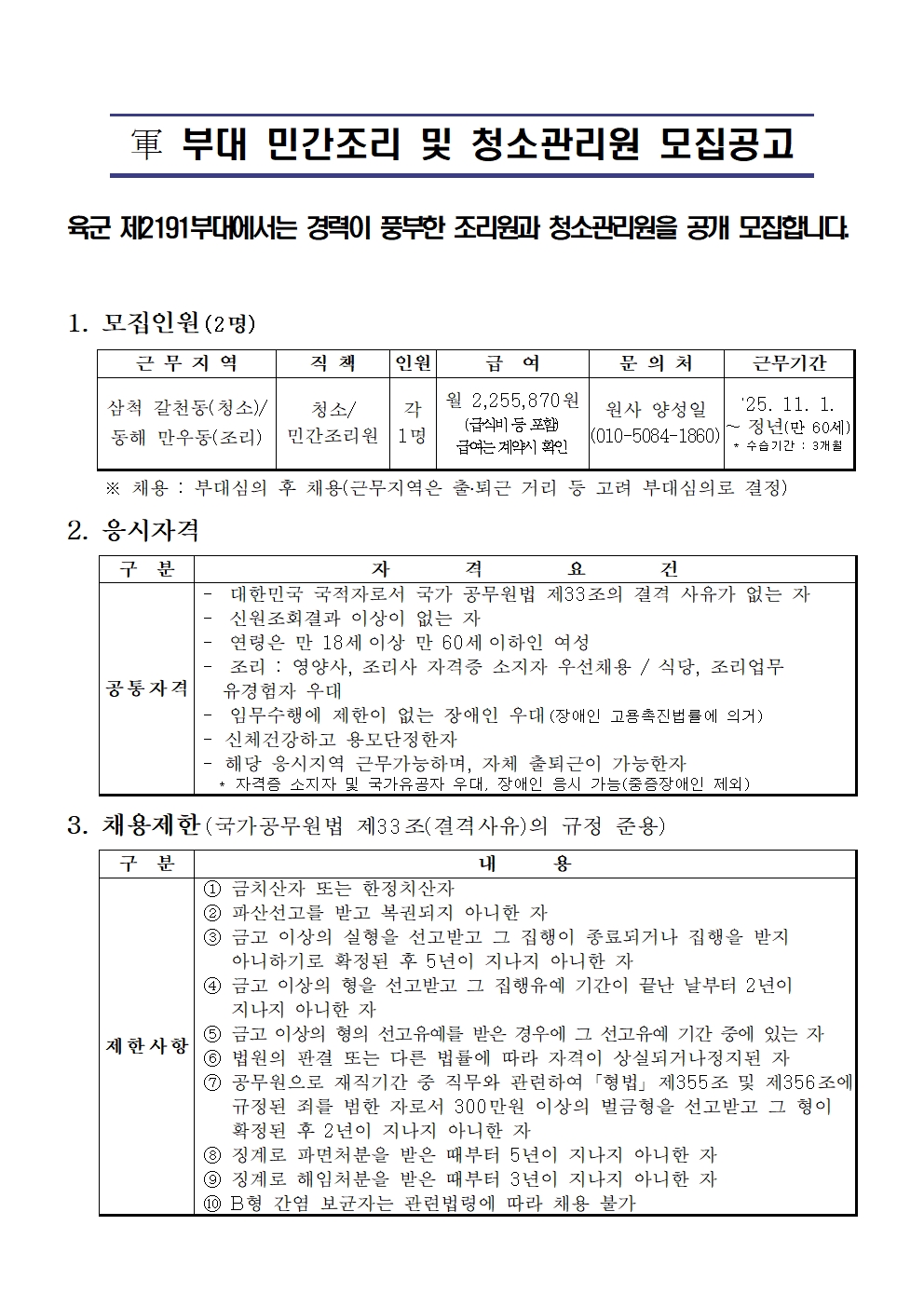 [동해시/구인] 민간조리 및 청소관리원 모집공고