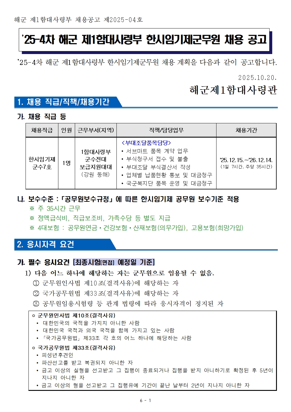 [동해시/구인] ’25-4차 한시임기제군무원 채용 공고