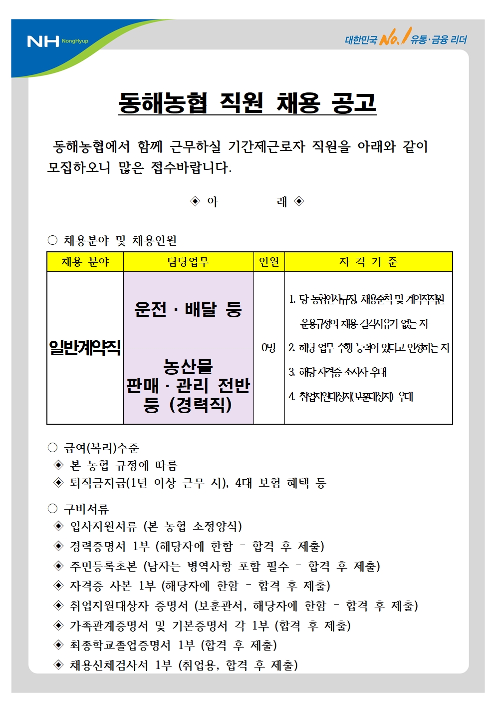 [동해시/구인] 직원(운전·배달 등, 농산물 판매·관리 전반 등 (경력직)) 채용 공고