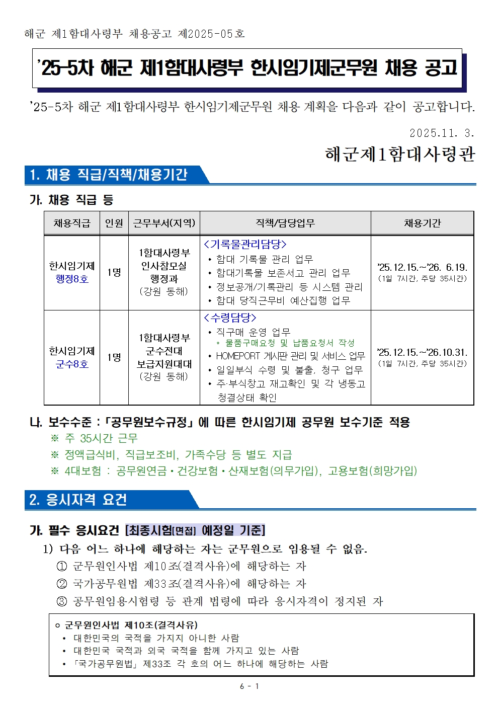 [동해시/구인] ’25-5차 한시임기제 군무원 채용 공고
