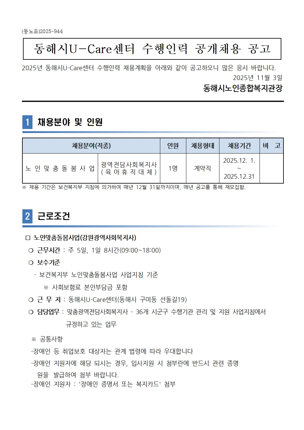 [동해시/구인] 수행인력(광역전담사회복지사_육아휴직대체) 공개채용 공고
