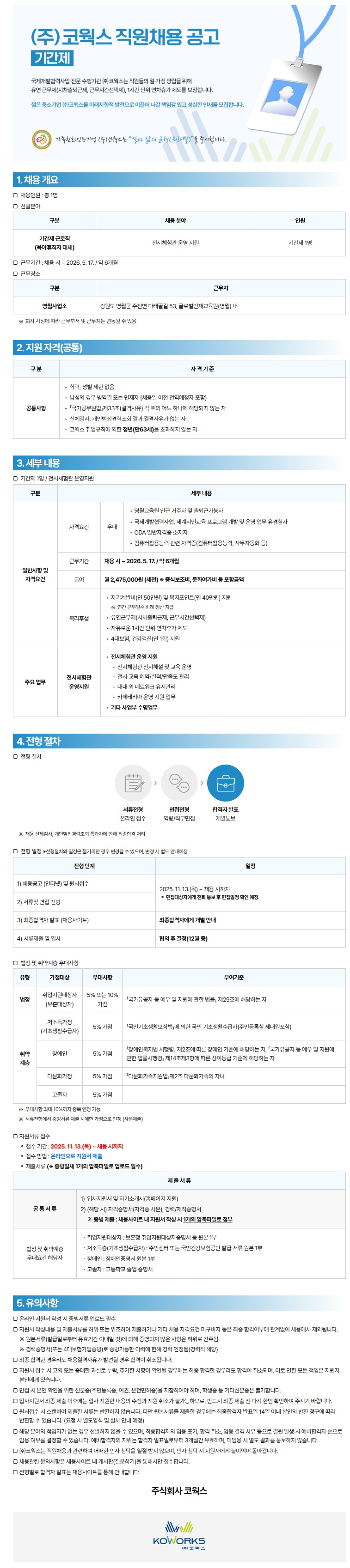 [원주시/구인] 『(주)코웍스』 신규직원 모집공고 (기간제- 전시체험관 운영지원)