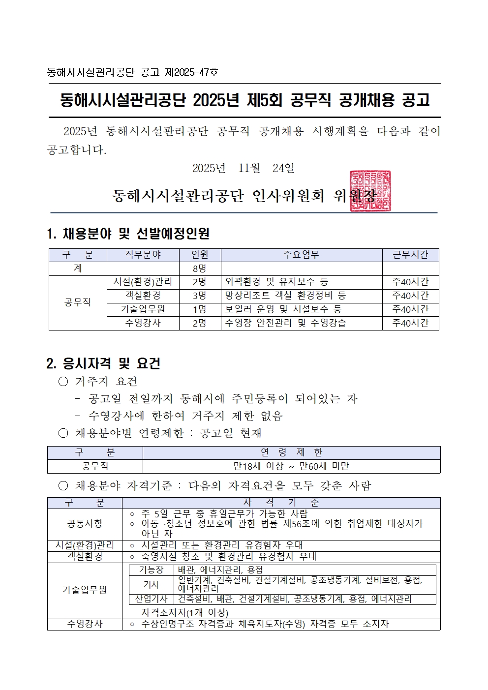 [동해시/구인] 2025년 제5회 공무직(시설(환경)관리, 객실환경, 기술업무원, 수영강사) 공개채용 공고