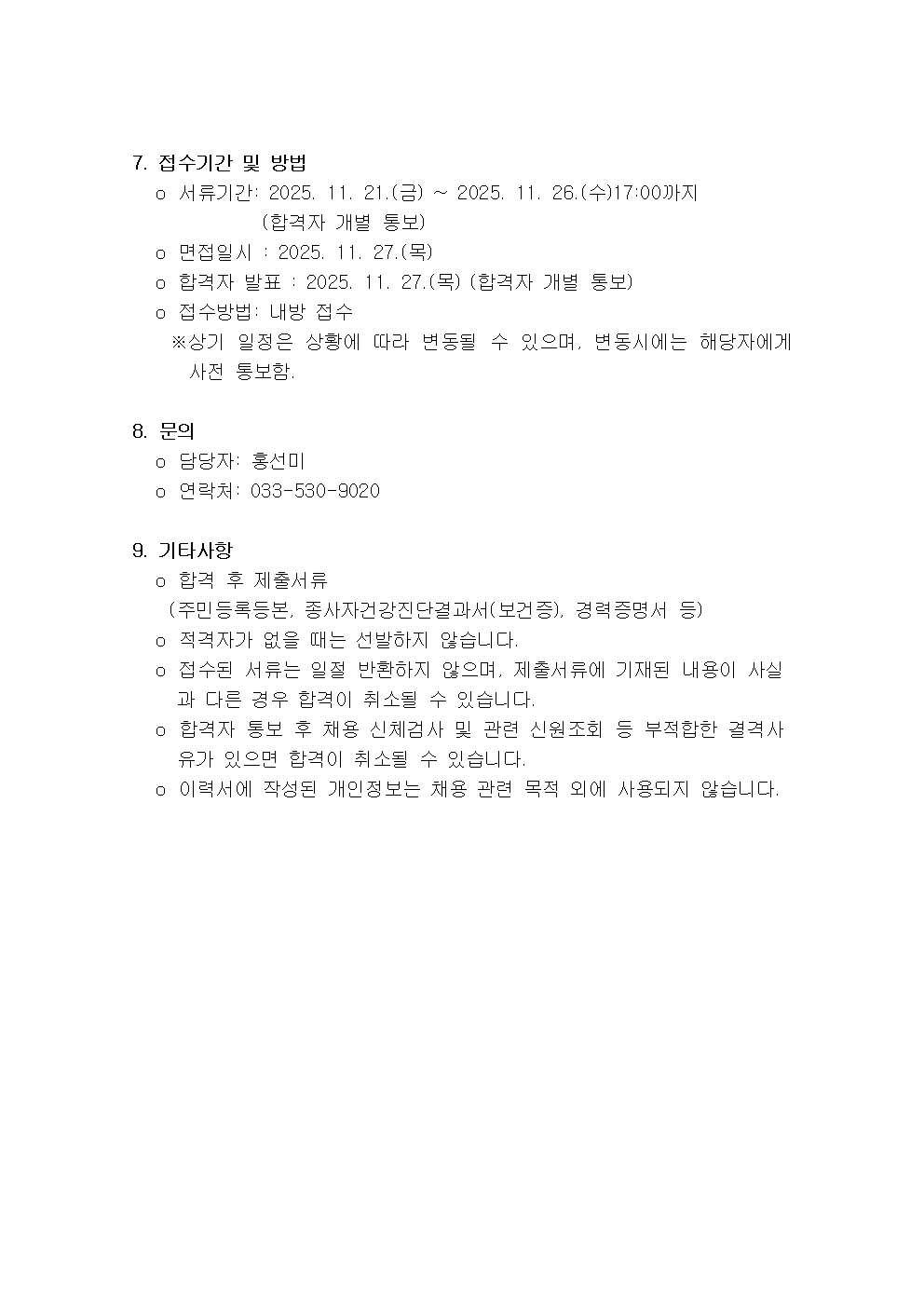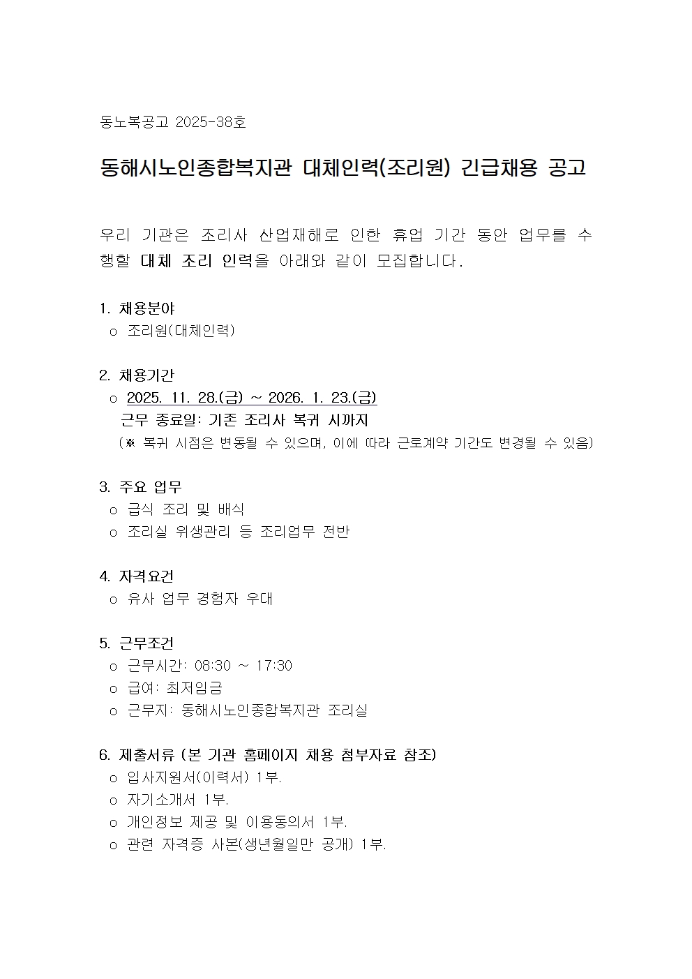 [동해시/구인] 대체인력(조리원) 긴급채용 공고