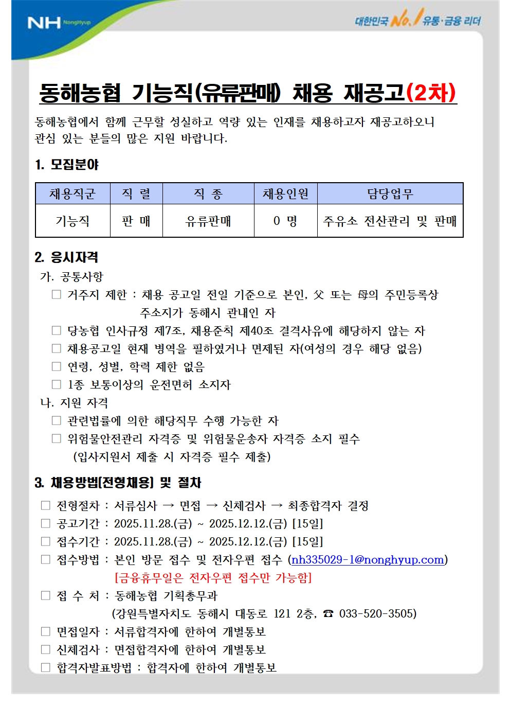 [동해시/구인] 기능직(유류판매) 채용 재공고(2차)