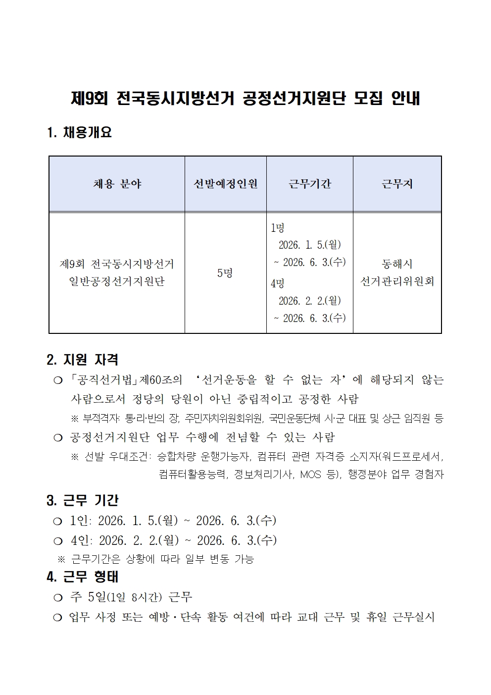 [동해시/구인] 제9회 전국동시지방선거 공정선거지원단 모집