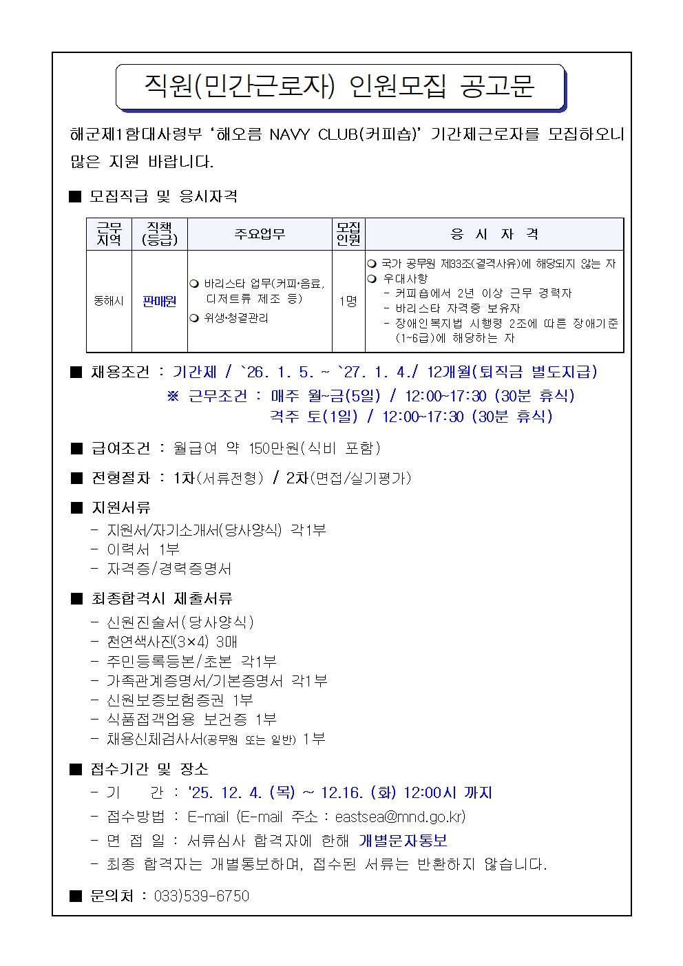[동해시/구인] ‘해오름 NAVY CLUB(커피숍)’ 기간제근로자 모집 Home채용정보96742 윈디 윈디님의 홈 전체게시물 아이디로 검색 윈디님의 홈 전체게시물 아이디로 검색 1시간 4분전 75 0 0 LV.1 62% 첨부파일 : 해오름까페 모집공고(2호점 오후).hwp Content-Length: 58880 Vary: User-Agent Access-Control-Allow-Origin: https://eminwon.dh.go.kr Content-Security-Policy: object-src (57.5K) 다운로드 0 2025-12-04 20:20:02 관련링크 : https://www.dh.go.kr/www/selectBbsNttView.do;JSESSIONID=634D8F6523EFDA7B418C28AD452C3374?key=745&bbsNo=125&nttNo=197342&searchCtgry=&searchCnd=all&searchKrwd=&integrDeptCode=&a… 6회 연결 신고 목록 게시글 신고 안내 아래 내용중 해당하는 내용이 있을경우 아래 게시글신고 버튼을 클릭하시고 사유를 작성해주시면 빠른시간 안에 삭제및 필요조치하여 드리겠습니다. 로그인후 이용이 가능합니다. 그리고 답변은 메뉴 아이러브강원 > 1:1문의에서 확인이 가능합니다. 자신 또는 제3자를 비방하거나 중상 모략으로 명예를 손상시키는 내용 범죄행위와 관련이 있다고 판단되는 내용 다른 회원 또는 제3자의 저작권 등 기타 권리를 침해하는 내용 타인의 개인정보, 사생활을 침해하거나 명예를 손상시키는 경우 자신의 글을 타인이 도용한 경우 위의 내용 이외에 기타사항 본문 이미지 확대보기 * 입사지원 서식은 아래 첨부파일을 확인하고, 지원하여 주시기 바랍니다. [출처 : 동해시청 -채용정보-] 0 로그인 후 추천을 하실 수 있습니다. 윈디 님의 최신글 윈디 님의 최신댓글 채용정보 - ‘해오름 NAVY CLUB(커피숍)’ 기간제근로자 모집 1시간 4분전 유머 - 초코파이 사면 장난감 주던 시절 2025-12-03 채용정보 - 새학기 영아반 담임교사 및 보조 연장교사 모집 2025-12-02 시군별소식 - 동해시 청소년 AI/SW 역량강화 특화 캠프(겨울) 참가자 모집 안내 2025-12-01 유머 - 침대 성능 2025-11-30 시군별소식 - 온 가족이 함께하는 참가자 모집 2025-11-29 채용정보 - 「송정지구 도시재생 현장지원센터」근무자 채용 공고 2025-11-29 채용정보 - [긴급] 조리원 모집 2025-11-28 뽐&팁 - 좋은팁 감사해용.... 2025-07-07 윈디 님의 최신글 윈디 님의 최신댓글 채용정보 - ‘해오름 NAVY CLUB(커피숍)’ 기간제근로자 모집 1시간 4분전 유머 - 초코파이 사면 장난감 주던 시절 2025-12-03 채용정보 - 새학기 영아반 담임교사 및 보조 연장교사 모집 2025-12-02 시군별소식 - 동해시 청소년 AI/SW 역량강화 특화 캠프(겨울) 참가자 모집 안내 2025-12-01 유머 - 침대 성능 2025-11-30 시군별소식 - 온 가족이 함께하는 참가자 모집 2025-11-29 채용정보 - 「송정지구 도시재생 현장지원센터」근무자 채용 공고 2025-11-29 채용정보 - [긴급] 조리원 모집 2025-11-28 뽐&팁 - 좋은팁 감사해용.... 2025-07-07 SNS 댓글목록 0 등록된 댓글이 없습니다.