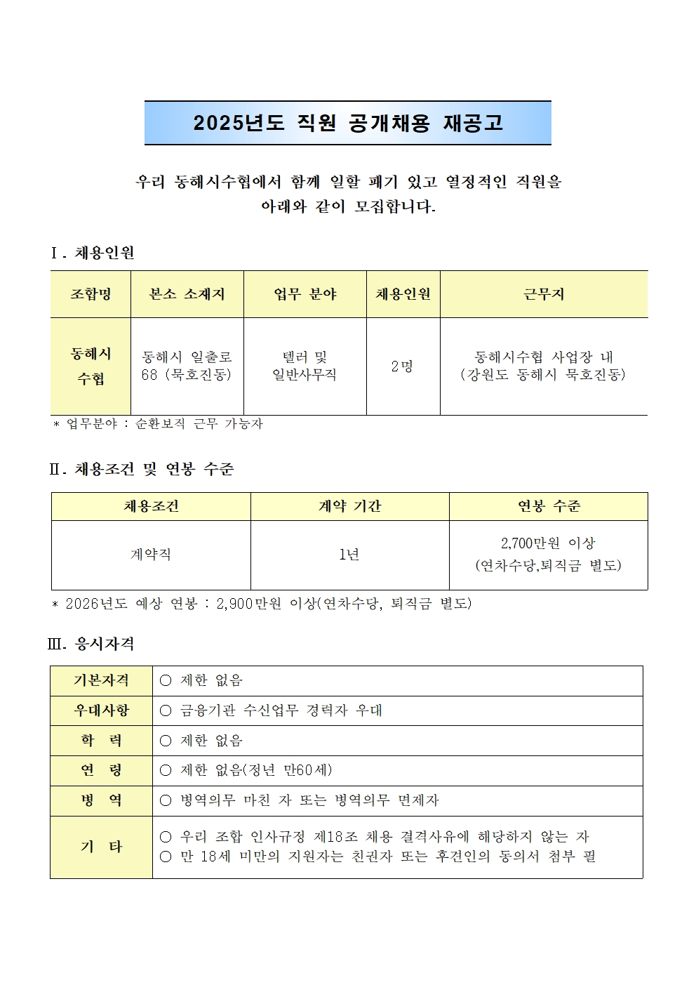 [동해시/구인] 2025년도 직원(계약직_텔러업무 및 일반사무직) 공개채용 재공고