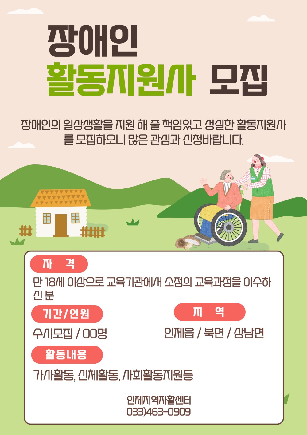 [인제군/구인] 장애인활동지원사 모집 Home채용정보97104 소셜우주 소셜우주님의 홈 전체게시물 아이디로 검색 소셜우주님의 홈 전체게시물 아이디로 검색 2시간 6분전 167 0 0 LV.1 69% 관련링크 : https://www.inje.go.kr/portal/participation/job?articleSeq=245011 11회 연결 신고 목록 게시글 신고 안내 아래 내용중 해당하는 내용이 있을경우 아래 게시글신고 버튼을 클릭하시고 사유를 작성해주시면 빠른시간 안에 삭제및 필요조치하여 드리겠습니다. 로그인후 이용이 가능합니다. 그리고 답변은 메뉴 아이러브강원 > 1:1문의에서 확인이 가능합니다. 자신 또는 제3자를 비방하거나 중상 모략으로 명예를 손상시키는 내용 범죄행위와 관련이 있다고 판단되는 내용 다른 회원 또는 제3자의 저작권 등 기타 권리를 침해하는 내용 타인의 개인정보, 사생활을 침해하거나 명예를 손상시키는 경우 자신의 글을 타인이 도용한 경우 위의 내용 이외에 기타사항 본문 장애인활동지원사를 모집합니다. 활동지원사 교육에 관심이 있으신 분이 있으시면 센터로 전화주세요! [출처 : 인제군청 -채용정보-] 0 로그인 후 추천을 하실 수 있습니다. 소셜우주 님의 최신글 소셜우주 님의 최신댓글 시군별소식 - 의료법인 행정처분에 따른 청문실시 공시송달 공고 2시간 6분전 채용정보 - 장애인활동지원사 모집 2시간 6분전 시군별소식 - 기린국민체육센터 1월 운영달력 및 강습모집 안내 2시간 6분전 채용정보 - '2026년 선영어린이집에서 함께 근무할 담임교사를 모집합니다' 2시간 6분전 채용정보 - ★홍천(서울방향) 휴게소 (조리원/세척원) 직원 모집 2025-12-22 채용정보 - 화재감시자 모집 안내 2025-12-22 채용정보 - 마포갈매기 원통점 구인합니다 2025-12-20 채용정보 - 사원 모집합니다 2025-12-20 최신글이 없습니다. 소셜우주 님의 최신글 소셜우주 님의 최신댓글 시군별소식 - 의료법인 행정처분에 따른 청문실시 공시송달 공고 2시간 6분전 채용정보 - 장애인활동지원사 모집 2시간 6분전 시군별소식 - 기린국민체육센터 1월 운영달력 및 강습모집 안내 2시간 6분전 채용정보 - '2026년 선영어린이집에서 함께 근무할 담임교사를 모집합니다' 2시간 6분전 채용정보 - ★홍천(서울방향) 휴게소 (조리원/세척원) 직원 모집 2025-12-22 채용정보 - 화재감시자 모집 안내 2025-12-22 채용정보 - 마포갈매기 원통점 구인합니다 2025-12-20 채용정보 - 사원 모집합니다 2025-12-20 최신글이 없습니다. SNS 댓글목록 0 등록된 댓글이 없습니다.