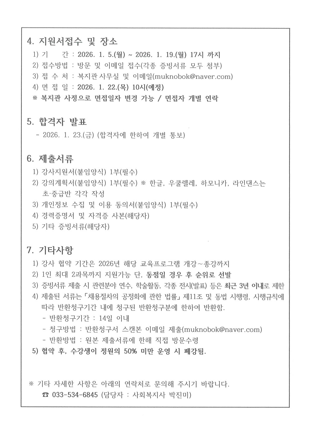 [동해시/구인] 2026년 묵호노인종합복지관 노년사회화교육 강사 모집 공고