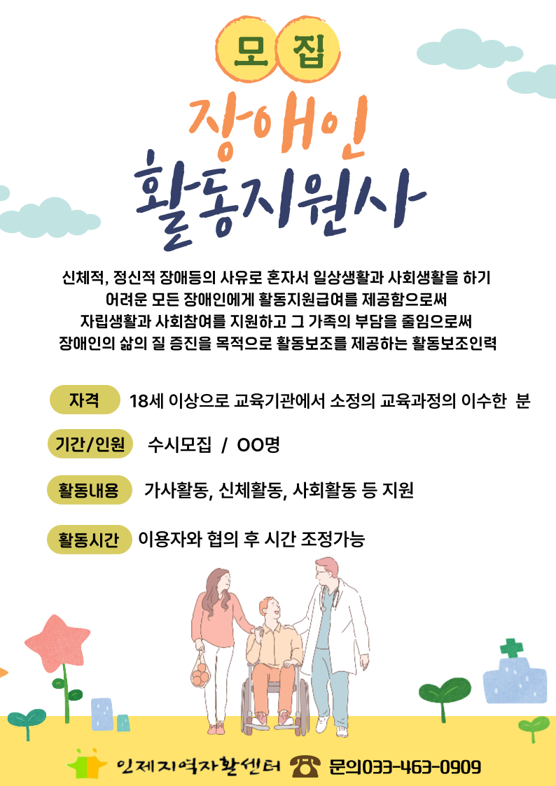 [인제군/구인] 장애인활동지원사를 모집합니다. Home채용정보97466 안드로메다 안드로메다님의 홈 전체게시물 아이디로 검색 안드로메다님의 홈 전체게시물 아이디로 검색 2시간 47분전 95 0 0 LV.1 90% 관련링크 : https://www.inje.go.kr/portal/participation/job?articleSeq=245605 15회 연결 신고 목록 게시글 신고 안내 아래 내용중 해당하는 내용이 있을경우 아래 게시글신고 버튼을 클릭하시고 사유를 작성해주시면 빠른시간 안에 삭제및 필요조치하여 드리겠습니다. 로그인후 이용이 가능합니다. 그리고 답변은 메뉴 아이러브강원 > 1:1문의에서 확인이 가능합니다. 자신 또는 제3자를 비방하거나 중상 모략으로 명예를 손상시키는 내용 범죄행위와 관련이 있다고 판단되는 내용 다른 회원 또는 제3자의 저작권 등 기타 권리를 침해하는 내용 타인의 개인정보, 사생활을 침해하거나 명예를 손상시키는 경우 자신의 글을 타인이 도용한 경우 위의 내용 이외에 기타사항 본문 장애인활동지원사를 모집합니다. [출처 : 인제군청 -채용정보-] 0 로그인 후 추천을 하실 수 있습니다. 안드로메다 님의 최신글 안드로메다 님의 최신댓글 채용정보 - 장애인활동지원사를 모집합니다. 2시간 47분전 채용정보 - [하늘내린유치원]2026년도 하늘내린유치원 돌봄교실 인력 채용 공고 2시간 47분전 채용정보 - 다이소 인제점에서 주말(오전/오후)알바 모집합니다. 2026-01-10 Q&A - 춘천에서 꼭 가봐야 할 숨은 명소 추천해주세요! 2026-01-10 시군별소식 - 26년 사회적 약자의 반려동물 진료비 지원 계획 2026-01-09 채용정보 - 원통 파스타집이야에서 함께하실 분 모십니다. 2026-01-09 채용정보 - 용대리 다리골식당 직원 구인공고 2026-01-09 채용정보 - ◆◆◆ 빽다방 강원인제점 오픈 알바 구인합니다. ◆◆◆ 2026-01-09 Q&A - ● 아래에서 2번이나 2-1번 버스 운행 시간표를 보세요.. http://its.wonju.go.kr/bus/bus04.do 2026-01-05 뽐&팁 - 멋찌네요.. 2025-08-06 뽐&팁 - 고흐~~~작품이네요 2025-08-06 뽐&팁 - 멋짐니다. 2025-08-06 안드로메다 님의 최신글 안드로메다 님의 최신댓글 채용정보 - 장애인활동지원사를 모집합니다. 2시간 47분전 채용정보 - [하늘내린유치원]2026년도 하늘내린유치원 돌봄교실 인력 채용 공고 2시간 47분전 채용정보 - 다이소 인제점에서 주말(오전/오후)알바 모집합니다. 2026-01-10 Q&A - 춘천에서 꼭 가봐야 할 숨은 명소 추천해주세요! 2026-01-10 시군별소식 - 26년 사회적 약자의 반려동물 진료비 지원 계획 2026-01-09 채용정보 - 원통 파스타집이야에서 함께하실 분 모십니다. 2026-01-09 채용정보 - 용대리 다리골식당 직원 구인공고 2026-01-09 채용정보 - ◆◆◆ 빽다방 강원인제점 오픈 알바 구인합니다. ◆◆◆ 2026-01-09 Q&A - ● 아래에서 2번이나 2-1번 버스 운행 시간표를 보세요.. http://its.wonju.go.kr/bus/bus04.do 2026-01-05 뽐&팁 - 멋찌네요.. 2025-08-06 뽐&팁 - 고흐~~~작품이네요 2025-08-06 뽐&팁 - 멋짐니다. 2025-08-06 SNS 댓글목록 0 등록된 댓글이 없습니다.