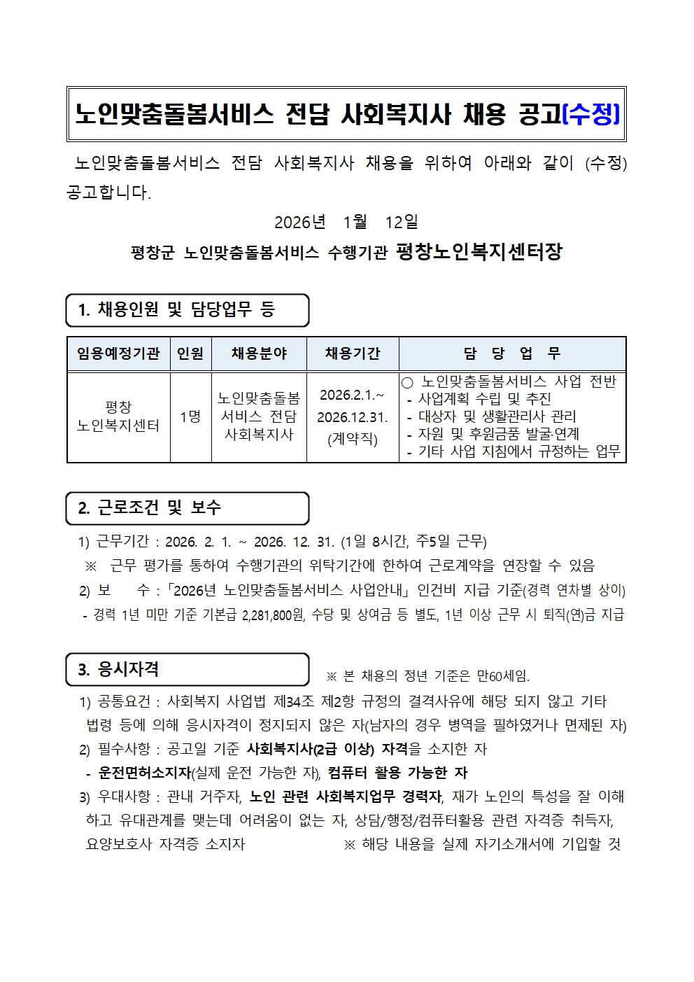 [평창군/구인] 평창노인복지센터 노인맞춤돌봄서비스 사회복지사 채용 재공고(수정)