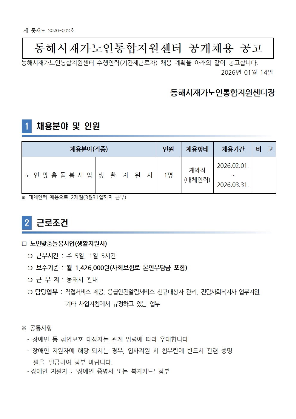 [동해시/구인] < 동해시재가노인통합지원센터 > 공개채용(생활지원사) 공고