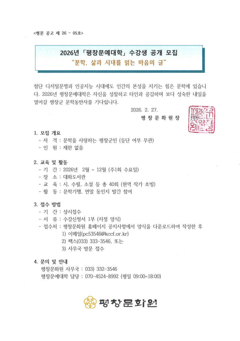 [평창군/구인] 2026년 "평창문에대학" 수강생 모집 공고