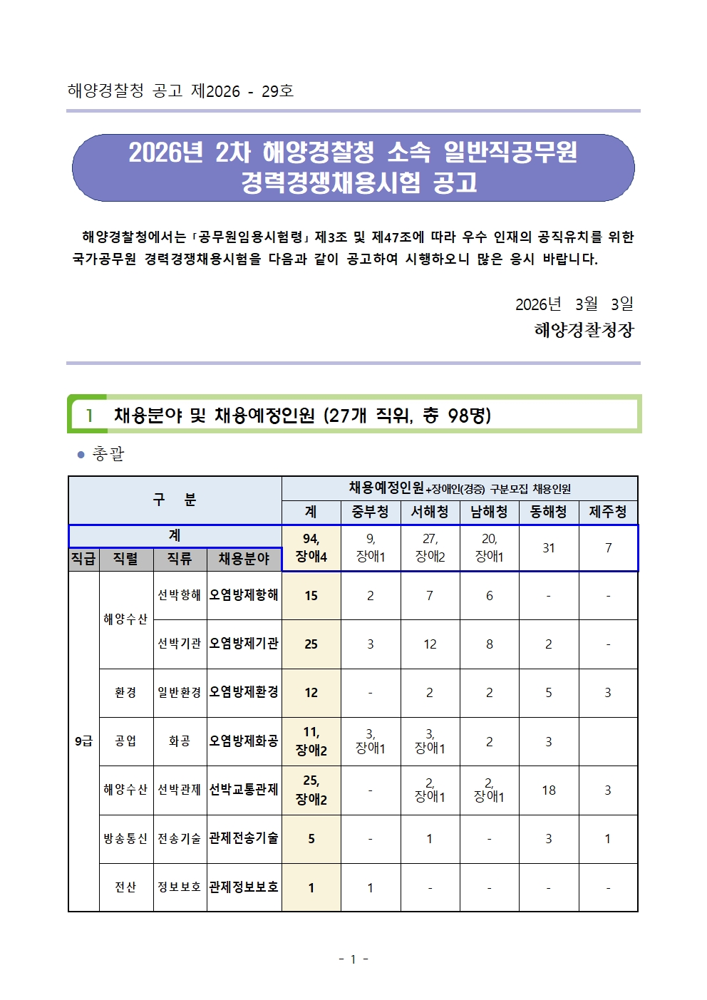 [동해시/구인] 2026년 2차 해양경찰청 소속 일반직공무원 경력경쟁채용시험 공고