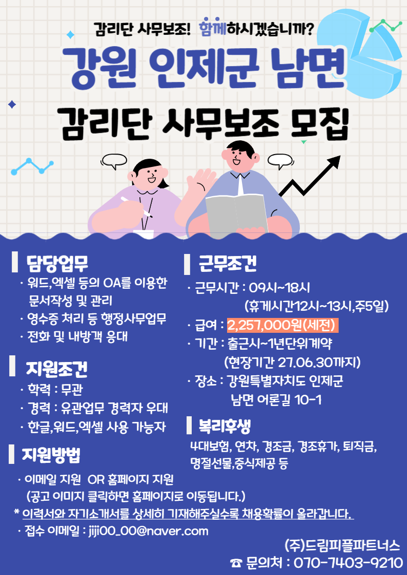 [인제군/구인] [인제군 남면/주5일] 감리단 사무보조 채용