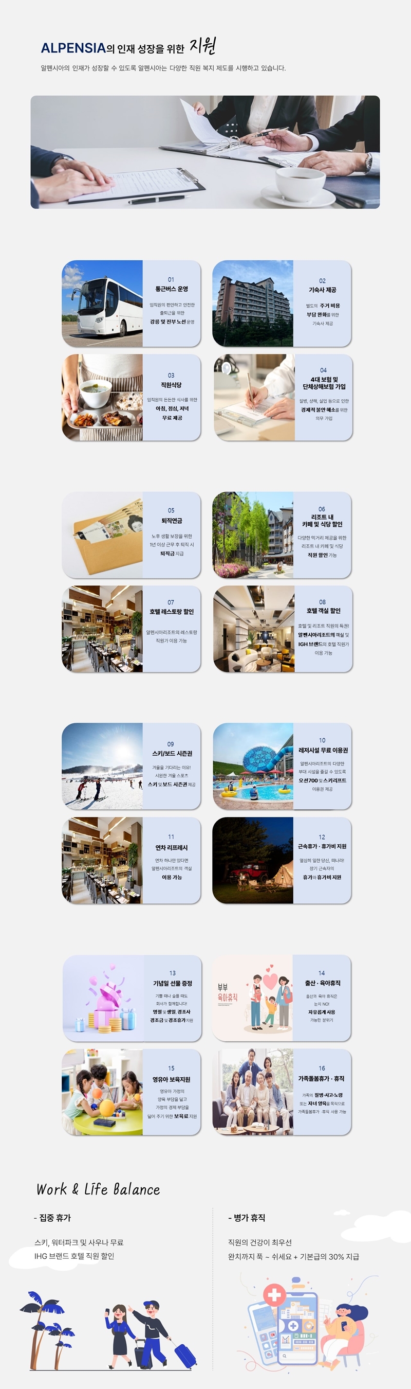 7. 복리후생 : 통근 셔틀버스, 기숙사(3인실) 제공, 근무복 제공, 리조트 시설이용 우대(호텔/콘도, 스키, 워터파크 등), 경조휴가 및 경조비, 명절선물, 건강검진, 기타 퇴직연금 및 연차휴가 등 법에서 정하는 사항 준수
