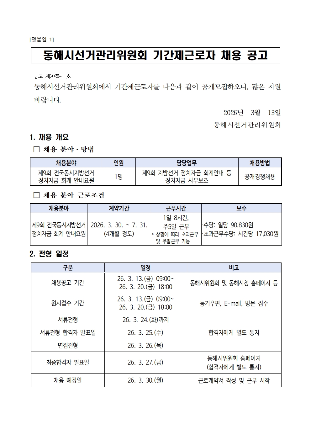 [동해시/구인] 기간제근로자(정치자금 회계 안내요원) 채용 공고
