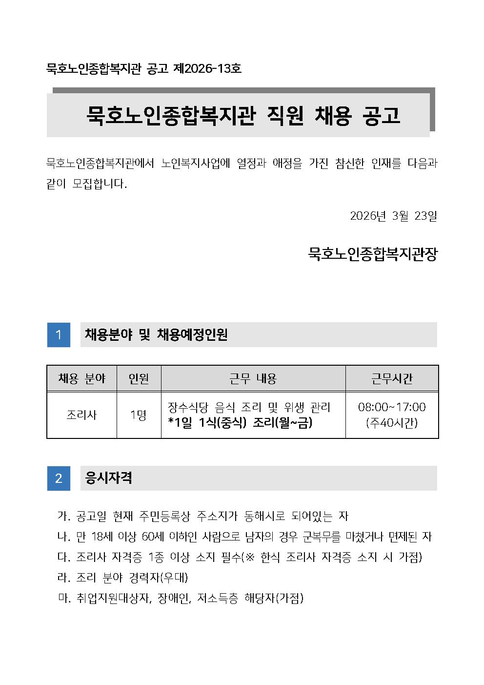 [동해시/구인] 직원(조리사) 채용 공고