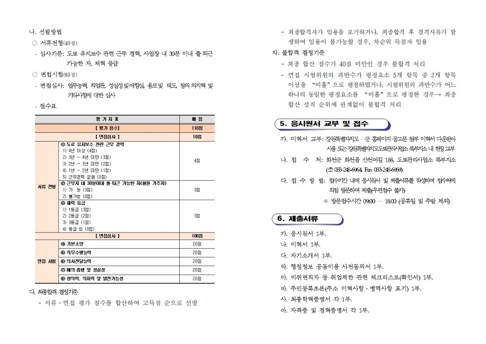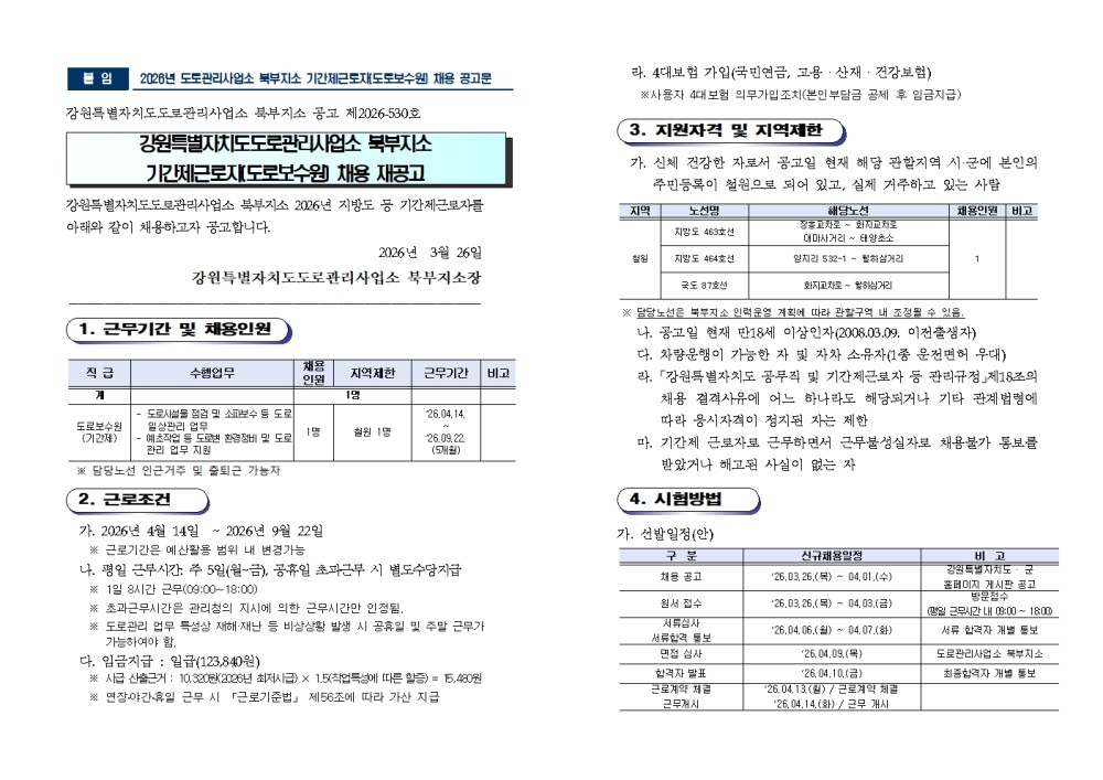 강원특별자치도도로관리사업소 북부지소 2026년 지방도 등 기간제근로자를 아래와 같이 채용하고자 공고합니다.
