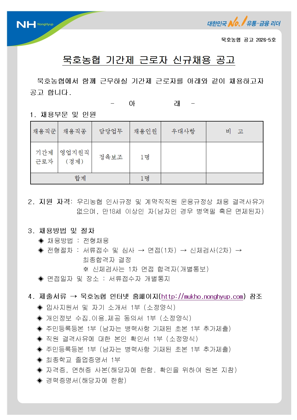 [동해시/구인] 기간제근로자(영업지원직-경제) 신규채용(정육 보조) 공고