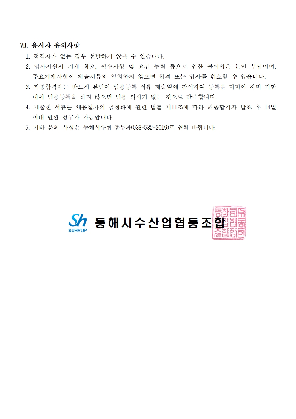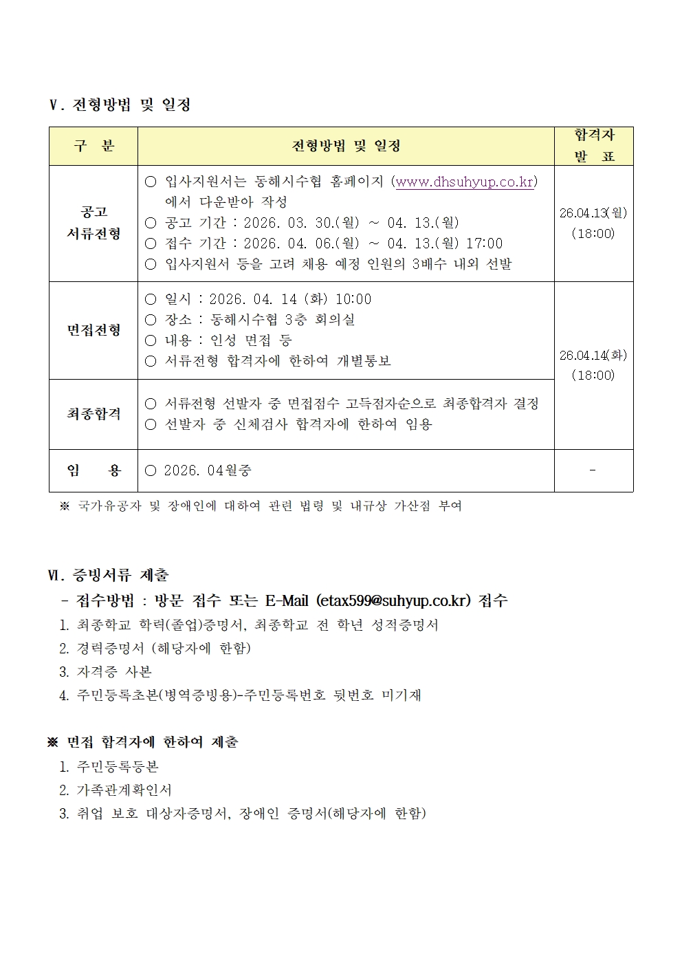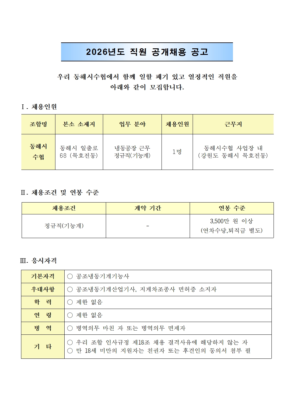 [동해시/구인] 2026년도 직원(정규직_냉동공장근무) 공개채용 공고