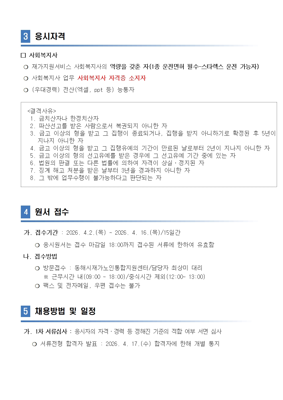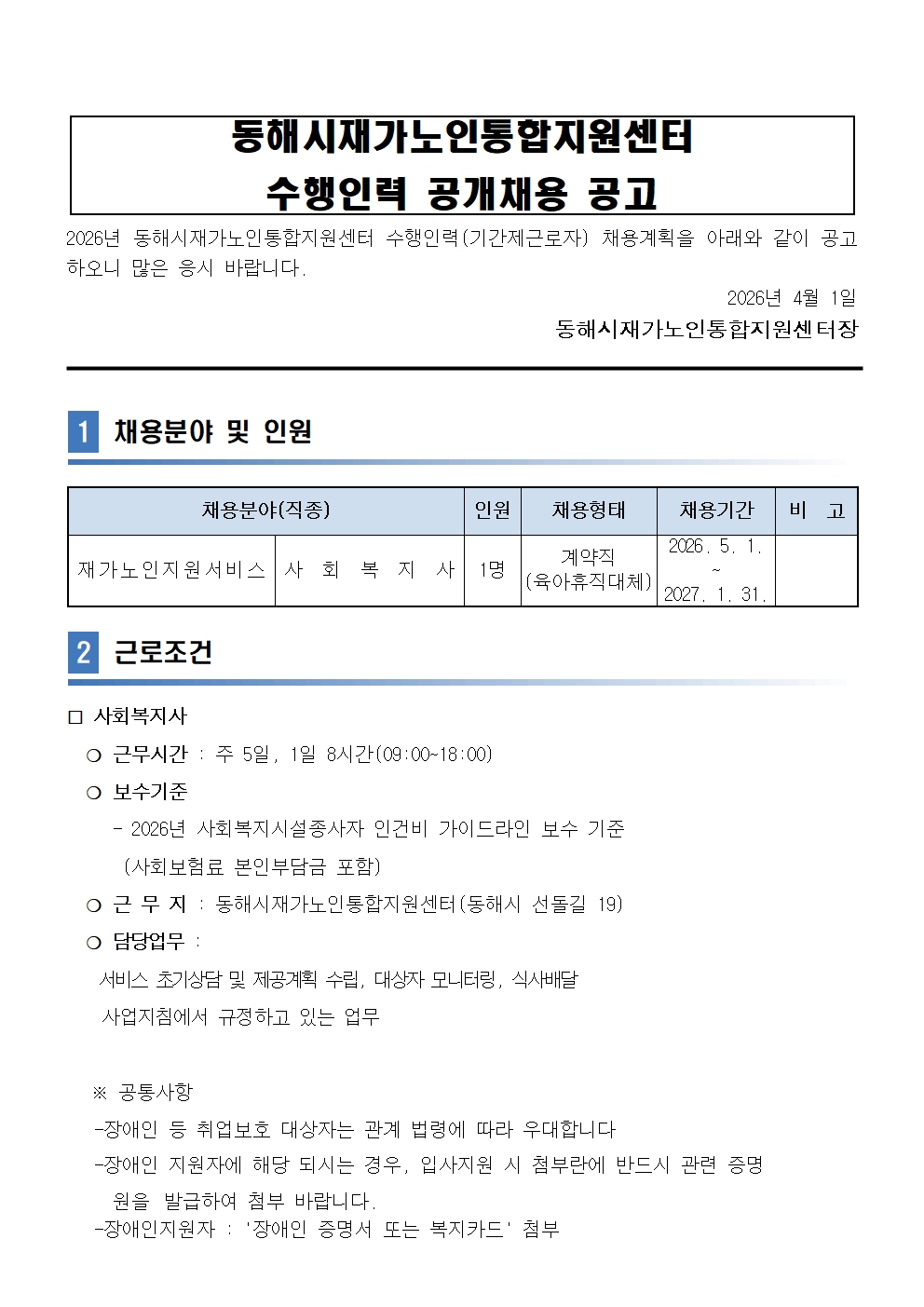 [동해시/구인] 수행인력(사회복지사) 공개채용 공고
