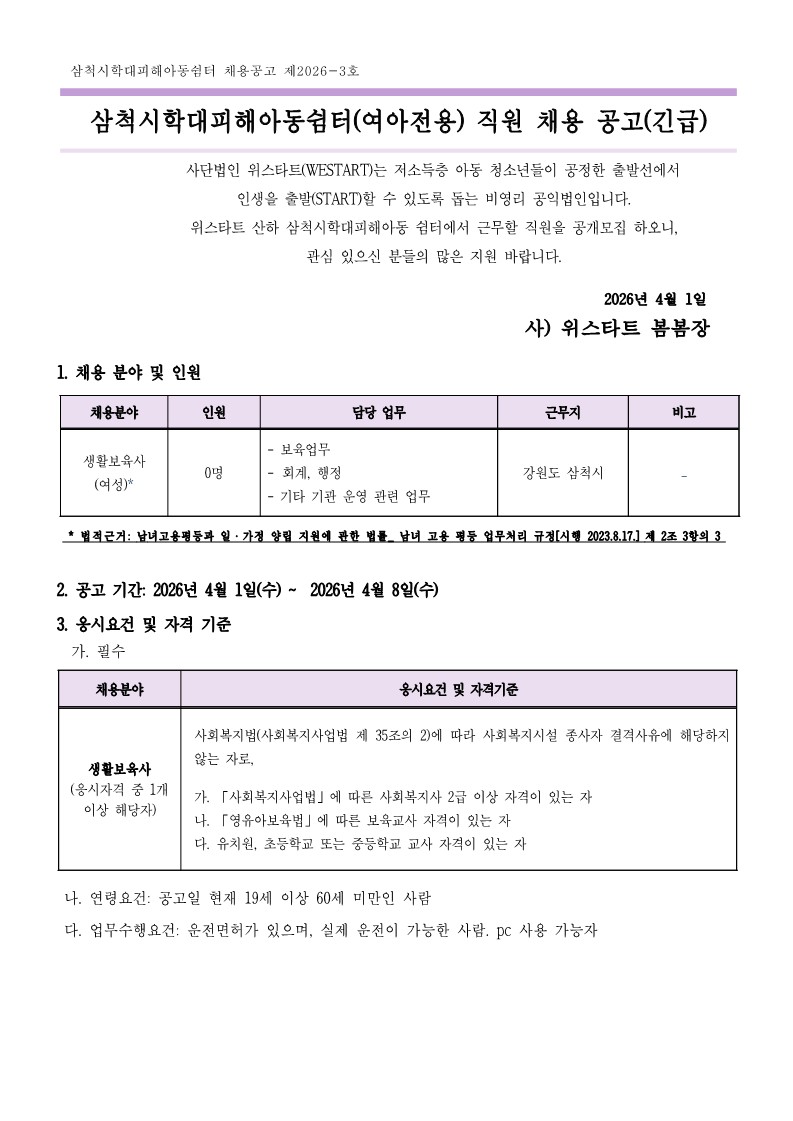 [동해시/구인] 삼척시학대피해아동쉼터(여아전용) 직원 채용 공고(긴급)