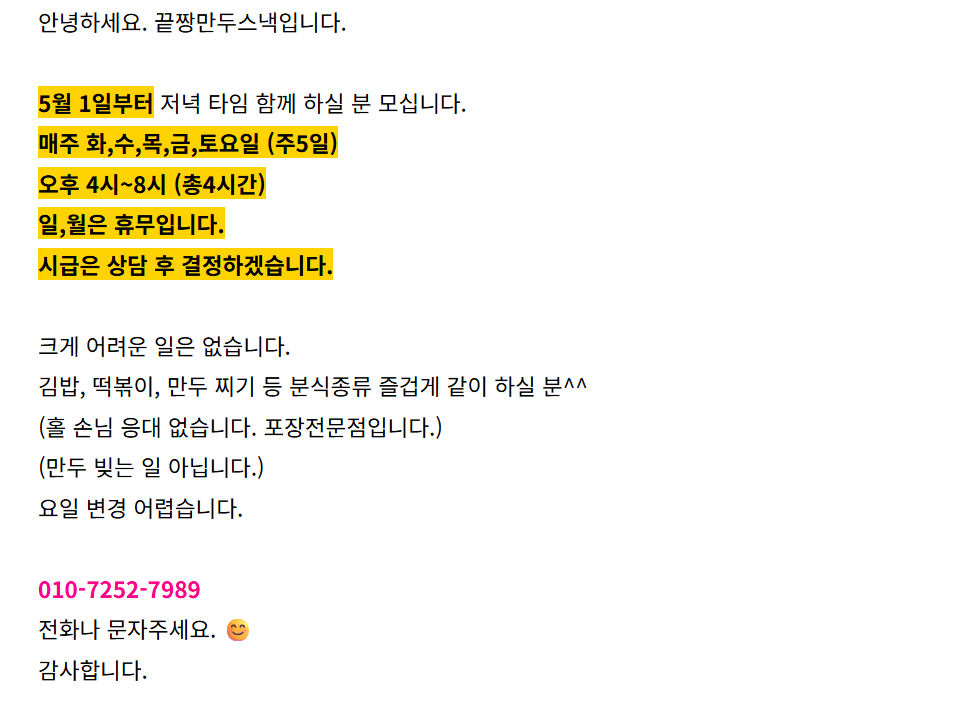 [인제군/구인] 끝짱만두스낵 저녁타임 함께 하실 분 모십니다 ^^ Home채용정보99614 소셜우주 소셜우주님의 홈 전체게시물 아이디로 검색 소셜우주님의 홈 전체게시물 아이디로 검색 2시간 21분전 137 0 0 LV.1 69% 관련링크 : https://www.inje.go.kr/portal/participation/job?articleSeq=248606 0회 연결 신고 목록 게시글 신고 안내 아래 내용중 해당하는 내용이 있을경우 아래 게시글신고 버튼을 클릭하시고 사유를 작성해주시면 빠른시간 안에 삭제및 필요조치하여 드리겠습니다. 로그인후 이용이 가능합니다. 그리고 답변은 메뉴 아이러브강원 > 1:1문의에서 확인이 가능합니다. 자신 또는 제3자를 비방하거나 중상 모략으로 명예를 손상시키는 내용 범죄행위와 관련이 있다고 판단되는 내용 다른 회원 또는 제3자의 저작권 등 기타 권리를 침해하는 내용 타인의 개인정보, 사생활을 침해하거나 명예를 손상시키는 경우 자신의 글을 타인이 도용한 경우 위의 내용 이외에 기타사항 본문 . [출처 : 인제군청 -채용정보-] 0 로그인 후 추천을 하실 수 있습니다. 소셜우주 님의 최신글 소셜우주 님의 최신댓글 채용정보 - 끝짱만두스낵 저녁타임 함께 하실 분 모십니다 ^^ 2시간 21분전 채용정보 - 인제군 공공하수처리시설 운영요원 모집 6시간 21분전 채용정보 - 여명개발 주식회사 국립용대자연휴양림 아르바이트 구합니다. (청소) 10시간 21분전 채용정보 - ■■신남점 메가커피 평일 주말 ■■ 14시간 21분전 채용정보 - ☆메가커피 원통점☆ 2026-04-05 채용정보 - ☞ 평일/휴일 마감 직원 구합니다. 2026-04-05 채용정보 - 대륙상사에서 PX납품 같이하실분 모셔봅니다. 2026-04-05 채용정보 - 편의점 알바구인 2026-04-04 최신글이 없습니다. 소셜우주 님의 최신글 소셜우주 님의 최신댓글 채용정보 - 끝짱만두스낵 저녁타임 함께 하실 분 모십니다 ^^ 2시간 21분전 채용정보 - 인제군 공공하수처리시설 운영요원 모집 6시간 21분전 채용정보 - 여명개발 주식회사 국립용대자연휴양림 아르바이트 구합니다. (청소) 10시간 21분전 채용정보 - ■■신남점 메가커피 평일 주말 ■■ 14시간 21분전 채용정보 - ☆메가커피 원통점☆ 2026-04-05 채용정보 - ☞ 평일/휴일 마감 직원 구합니다. 2026-04-05 채용정보 - 대륙상사에서 PX납품 같이하실분 모셔봅니다. 2026-04-05 채용정보 - 편의점 알바구인 2026-04-04 최신글이 없습니다. SNS 댓글목록 0 등록된 댓글이 없습니다.