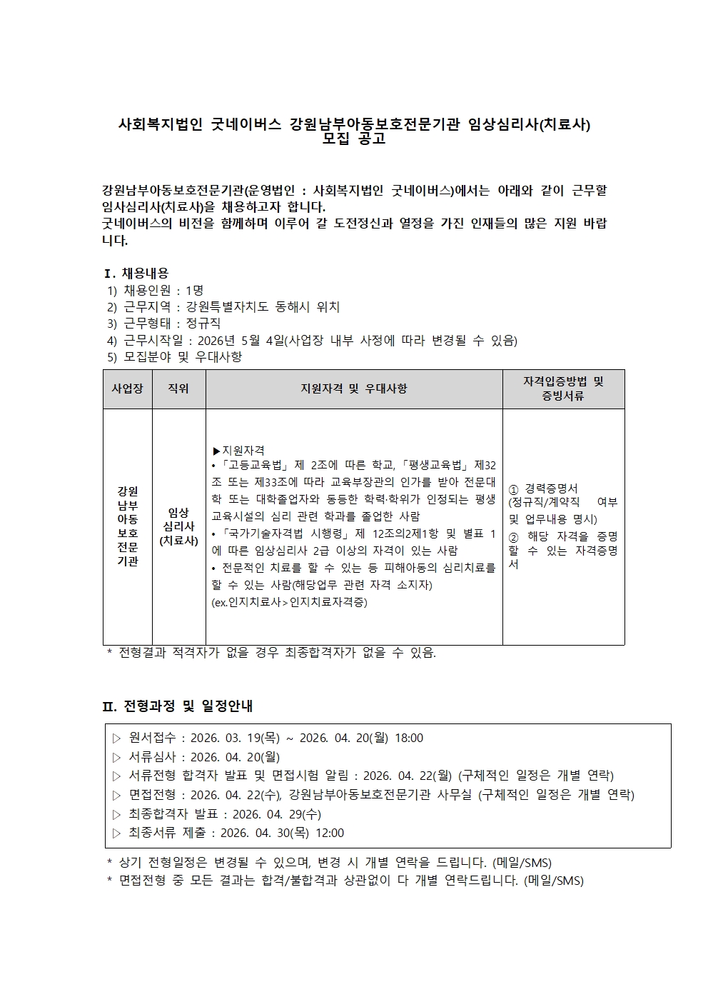 [동해시/구인] 임상심리사(치료사) 모집 공고