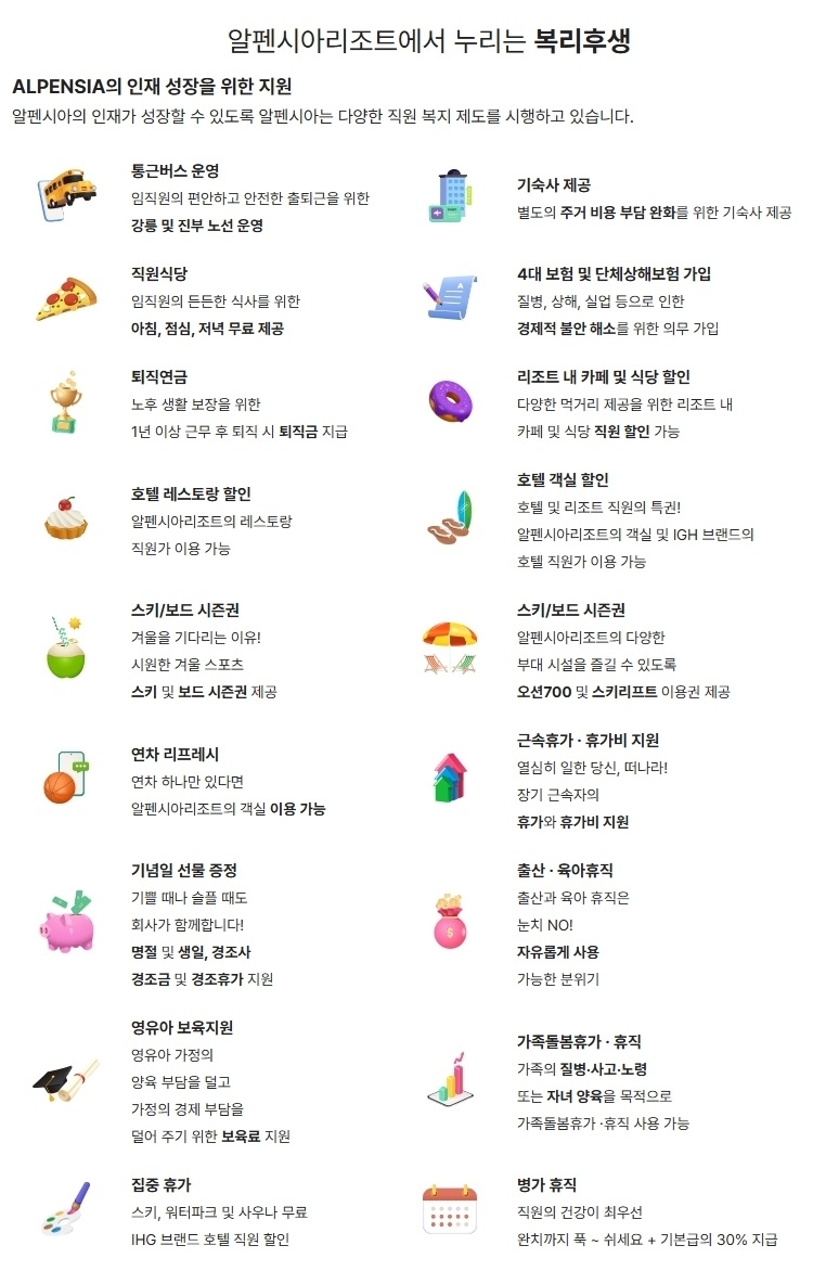 7. 복리후생 : 통근 셔틀버스, 기숙사(3인실) 제공, 근무복 제공, 리조트 시설이용 우대(호텔/콘도, 스키, 워터파크 등), 경조휴가 및 경조비, 명절선물, 건강검진, 기타 퇴직연금 및 연차휴가 등 법에서 정하는 사항 준수