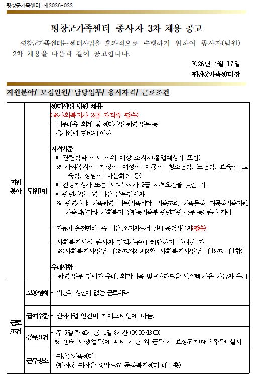 평창군가족센터 종사자(센터사업 팀원) 3차 채용 공고