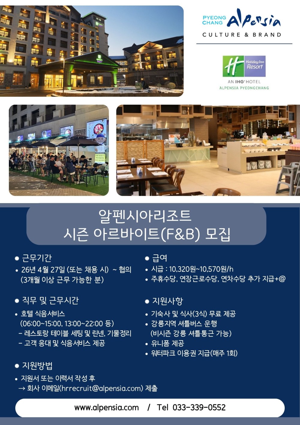 [평창군/구인] [알펜시아리조트] 레스토랑 홀서빙 아르바이트 모집