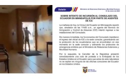 27일(현지시간) 에콰도르 영사관 진입 사건 당시 찍힌 동영상의 한 장면. 이 사건과 관련해 에콰도르 외교부가 항의 성명(오른쪽)을 발표했다. 사진 에콰도르 정부 홈페이지 캡처 미국 미네소타주 미니애폴리스에서 연방 이민 단속 요원들이 외국 영사관에 무단 진입을 시…