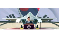 이재명 대통령이 25일 경남 사천시 KAI에서 열린 KF-21 양산 1호기 출고식에서 축사하고 있다. 이 대통령은 “대한민국의 땅과 바다에 이어 하늘에서까지 우리 기술과 의지로 평화를 지키는 무기를 보유하게 됐다”며 “대통령으로서 무한한 자부심을 안고 이 역사적인 순간…