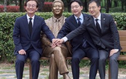 더불어민주당 부울경(부산,울산,경남) 시장도지사 후보가 14일 오전 경남 김해시 진영읍 봉하마을 노무현 전 대통령 묘역 참배 후 노 전 대통령 동상에서 기념 촬영하고 있다. 오른쪽부터 김상욱 울산시장 후보, 김경수 경남지사 후보, 전재수 부산시장 후보. 연합뉴스 …