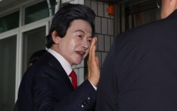 지난 16일 경기 의정부시 가능동 의정부지방법원에서 사기와 정치자금법 위반, 준강제추행 등의 혐의를 받는 허경영 국가혁명당 명예대표가 구속 전 피의자심문에 앞서 취재진 질문에 답변하고 있다. 연합뉴스 준강제추행과 사기 등 혐의를 받는 허경영 국가혁명당 명…