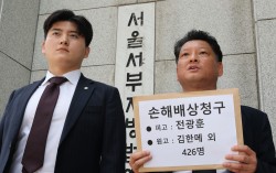 사법정의바로세우기시민행동 김한메 상임대표(오른쪽)와 법률대리인인 박강운 변호사가 21일 서울 마포구 서울서부지방법원 앞에서 사랑제일교회 전광훈 목사의 내란 및 폭력 선동 행위에 대한 정신적 피해 손해배상 청구 소송에 앞서 기자회견을 하고 있다. 연합뉴스 …