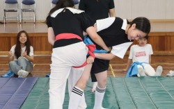 19일 부산 송운초등학교에서 열린 ‘찾아가는 스포츠 체험교실’에 참여한 학생들이 다양한 씨름 기술을 배우고 있다. 부산시교육청은 부산에서 열리는 전국체전을 앞두고 이같은 체험 행사를 운영 중이다.