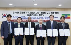 〈사진 좌측부터〉 에티오피아 도시인프라부 위임 이재기 커미셔너(코디네이터), 이민정책연구원 이규홍 부원장, AU 광물포럼 녹색연합(AGERE) 대표 에샤투 박사(Dr. Eshetu B. Yimenu), 광운대 천장호 총장, 한국건설기술연구원 박범진 도로교통연구본부장, …